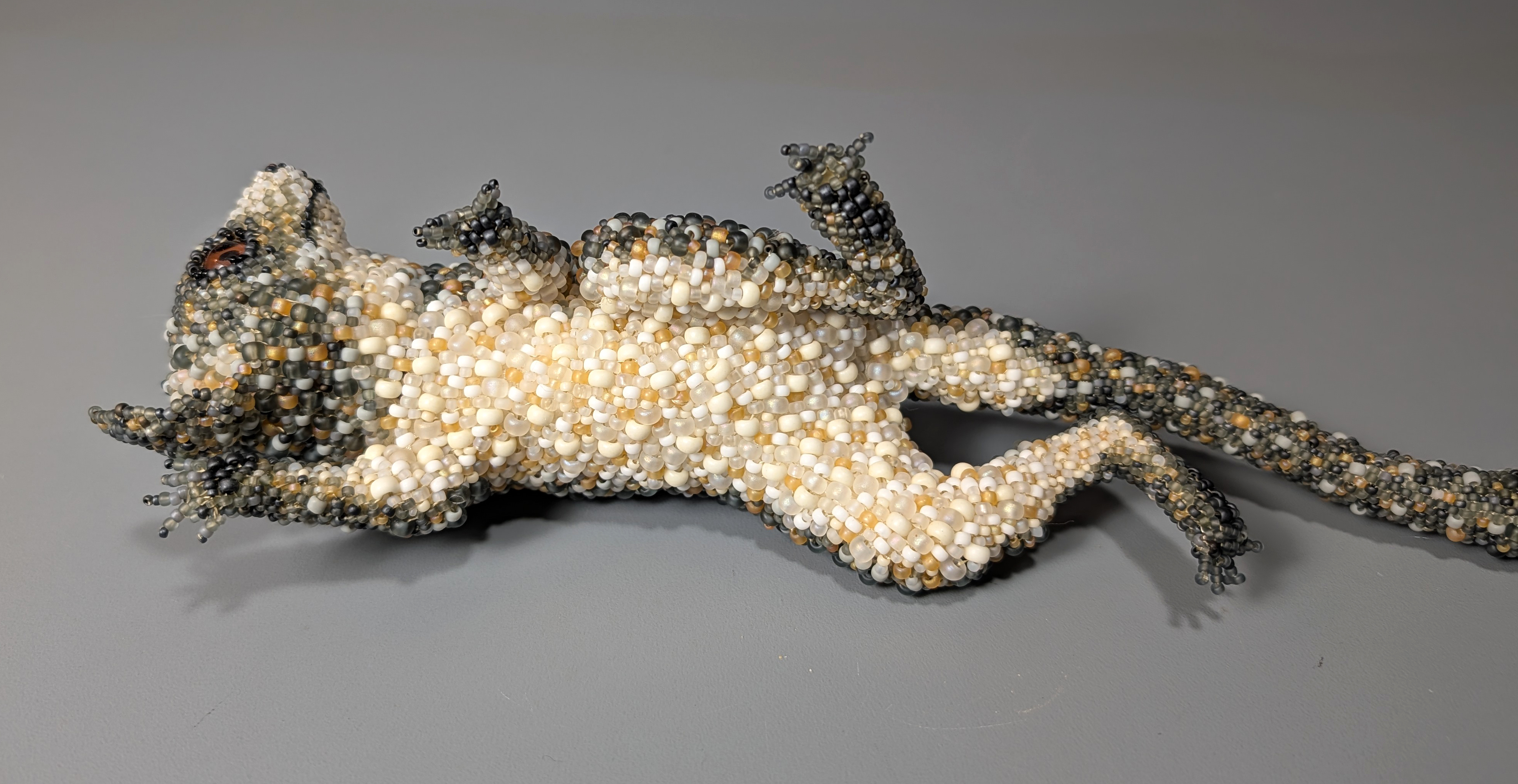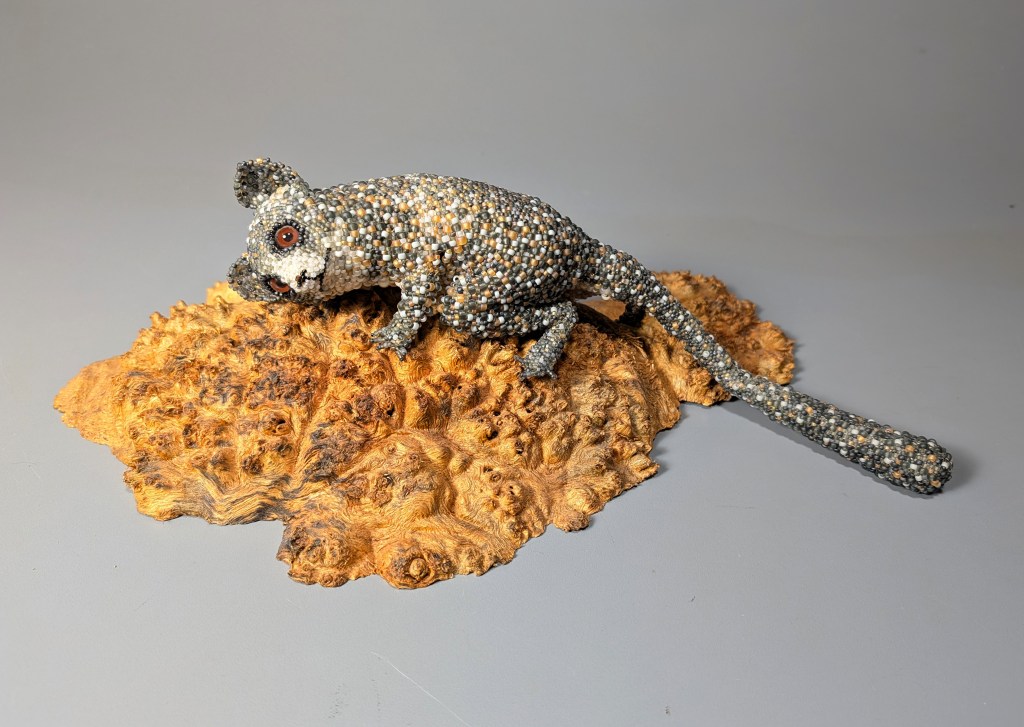 Wood burl, glass seed beads in peyote stitch over dense foam core, thread