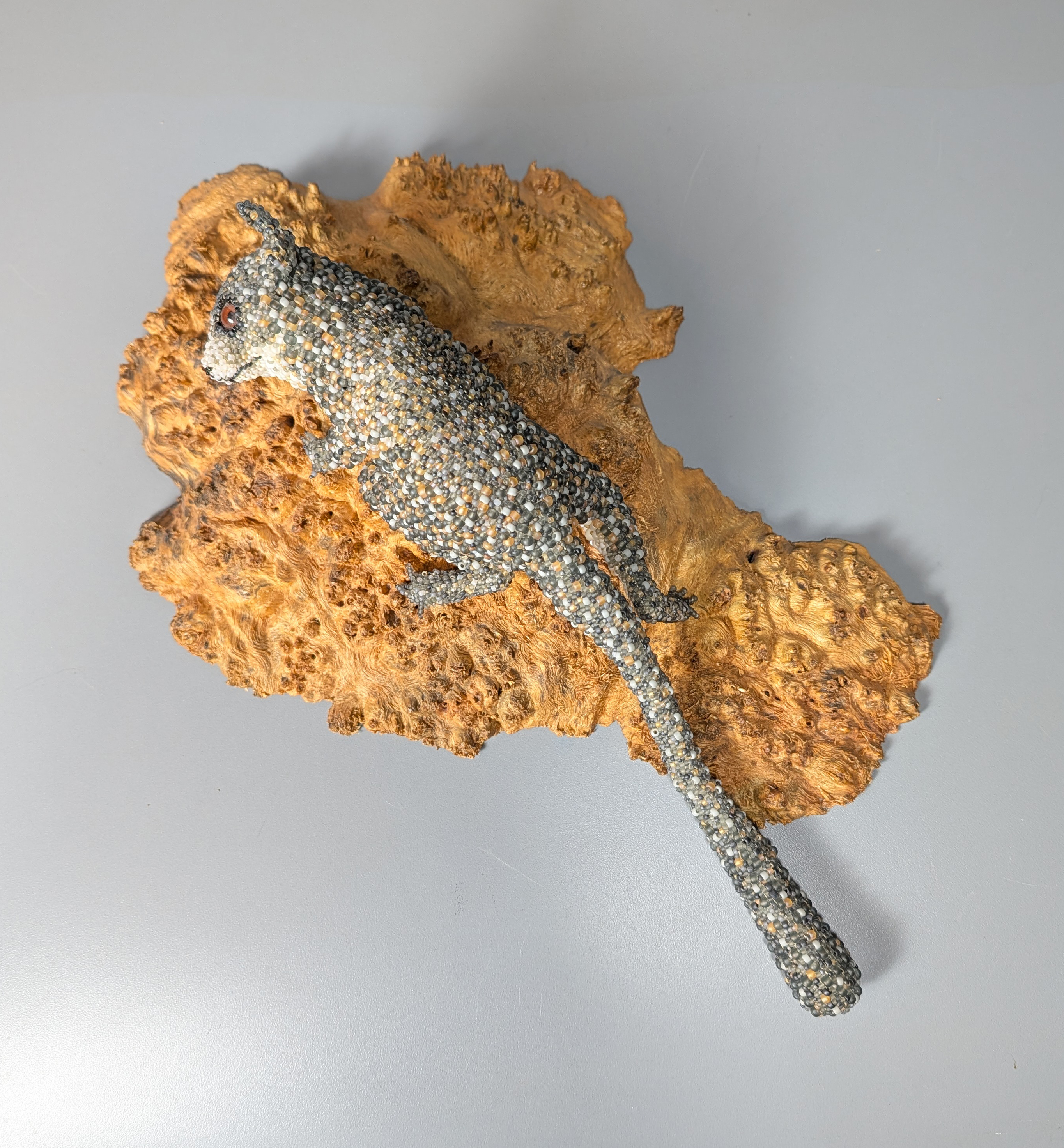 The expression on the face of this little guy reflects how I, and perhaps you(?) sometimes feel when wrestling with the World. Happily, for the most part, my life is pretty good. Similarly to several of my other animal figures, Bush Baby is intended to be enjoyed tactilely and can be lifted and held. The wooden burl is simply a wonderfully textured support.
