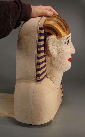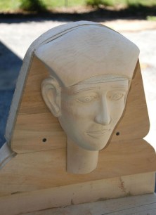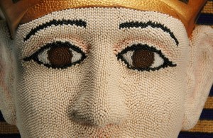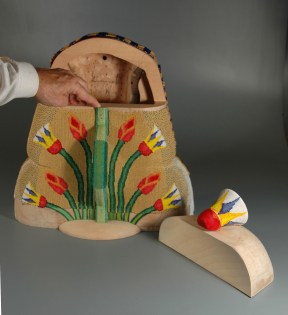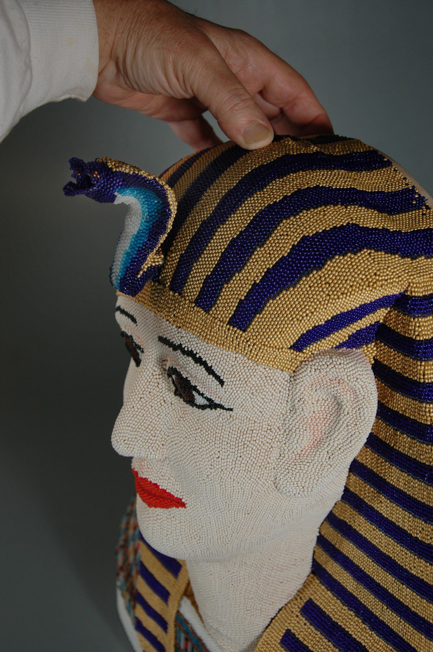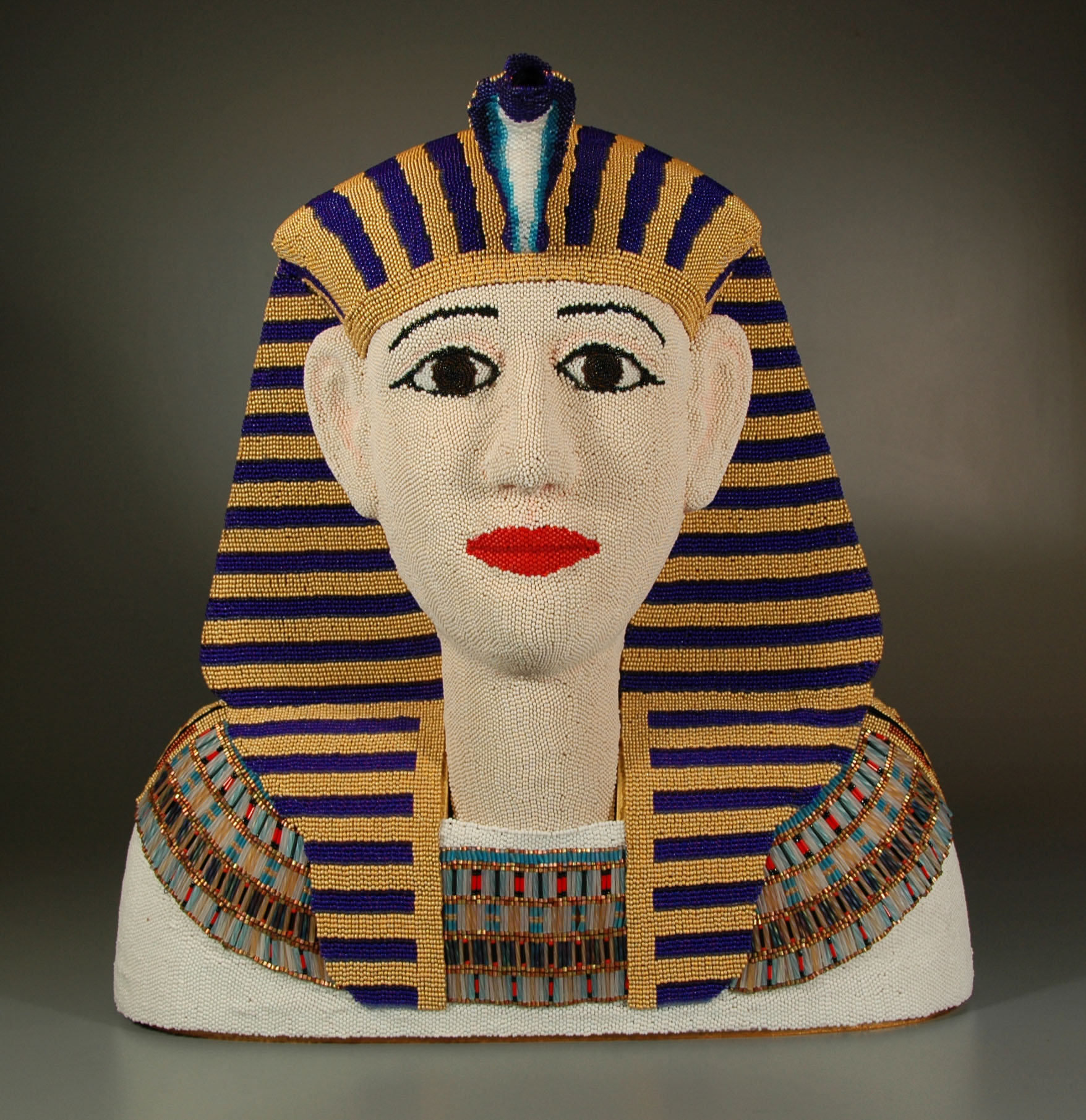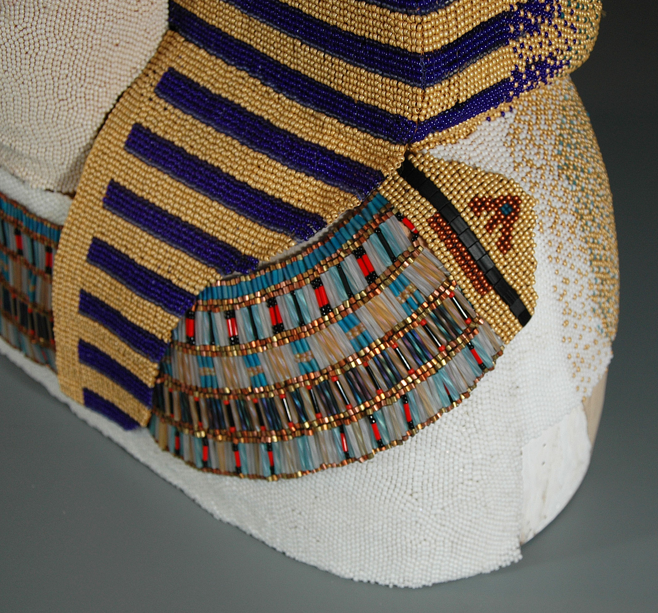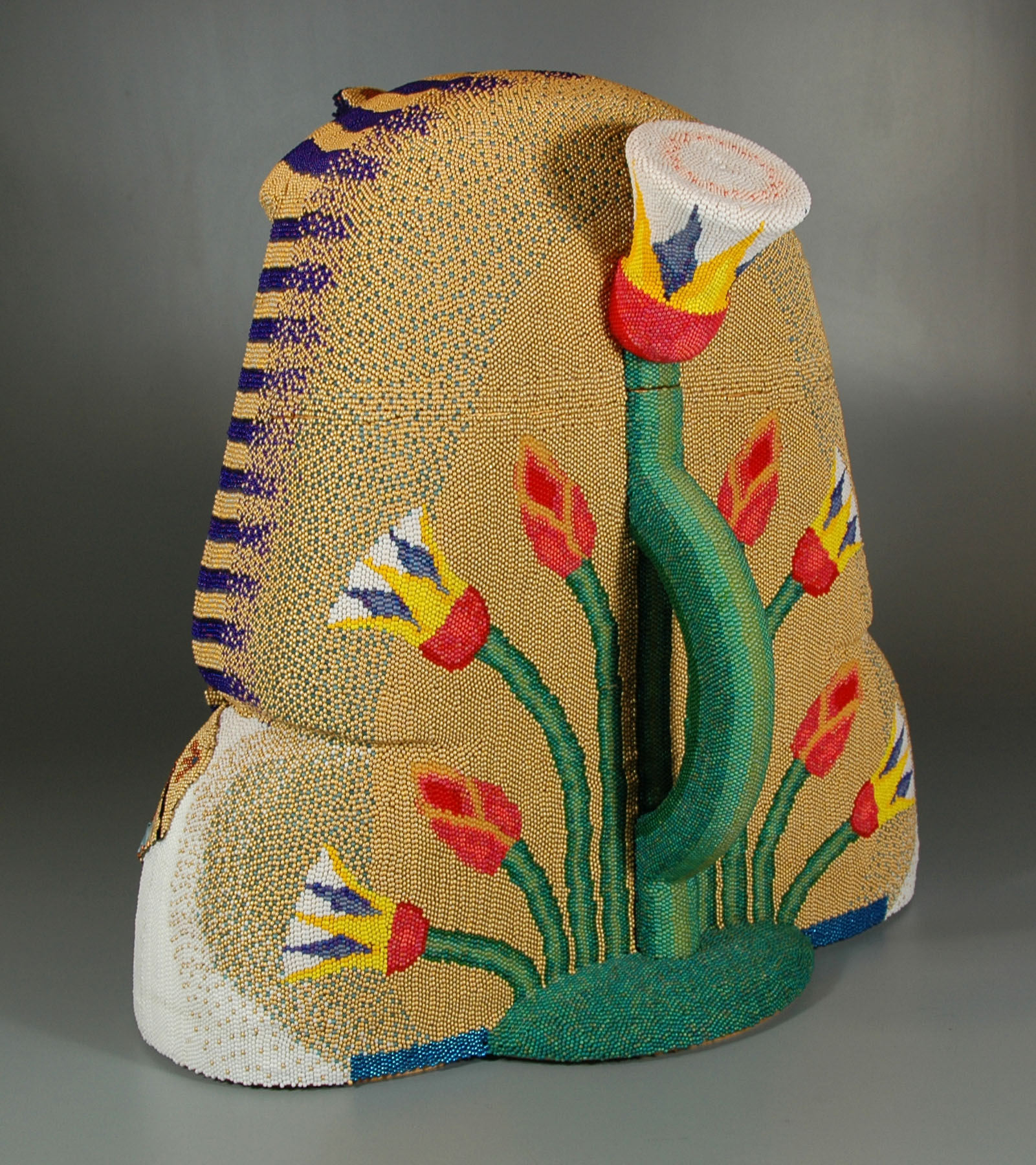 In January 2012, I completed my second commission for the respected Kamm Teapot Foundation Collection. (See also Water and Fish (Series: Water Ways).) This project is the largest, in terms of beaded surface area, that I yet have attempted. Although not truly usable to serve tea, the Egyptian Teapot was required to have all the elements of a teapot: a handle, a spout, a lid, etc. As is true of many of my sculptures, the work was a collaborative one. I was responsible for the design and completion of all of the beadwork, and the bulk of the woodworking was executed by my husband, Lindsay Grigsby. In the case of this sculpture, special assistance with the face carving was provided by local Pennsylvania craftsman, Fred Hoover.