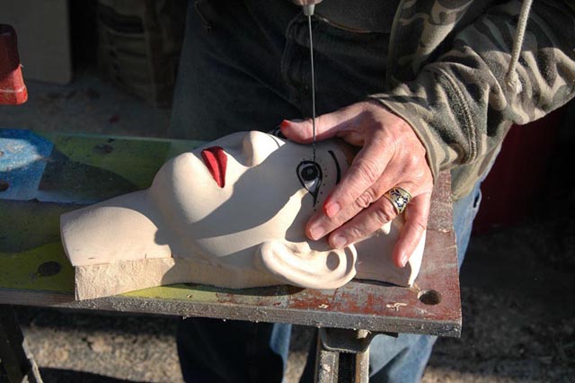 2) The teapot is disassembled to facilitate design layout and painting of the face. The face is selectively pierced, for beading.