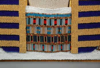 4) Below, is the front half of the pot with the necklace shown in ladder stitch, with bugle and seed beads. The white “dress” and forehead of the headdress are peyote-stitched in seed beads. The separate elements–shoulders, headdress sides, and head–are laid upon one another, but not quite ready for attachment, and the edges remain unfinished. The hole for the cobra-spout is centered on the forehead.