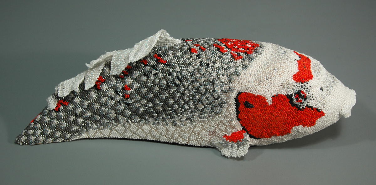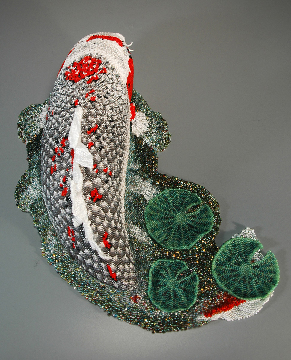 Phase 2: The koi began to “slim down” in appearance, as I neared completion of the beadwork on his body. The front fins soon would be enlarged and partially submerged in the water. The back fins and tail would appear as though they were under the pond’s surface.