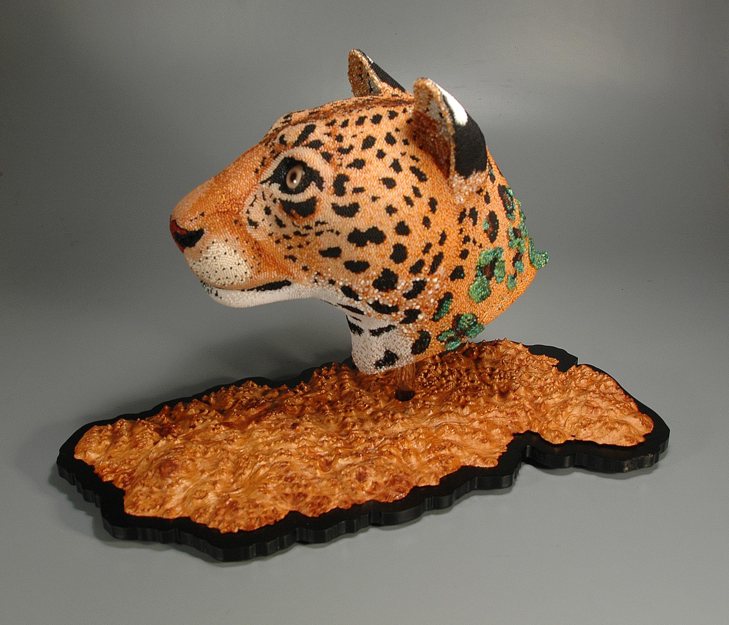 It took me nine months to get to know this wonderful creature, as I worked on him “nose-to-nose.” Over time, I created the surface using glass seed beads, primarily in peyote stitch. Below, in step one, you can see the dense-foam leopard head after I sketched out and colored in the primary elements of the pattern I hoped to complete. Nearby are the ears and glass eyes which eventually were assembled with the head.