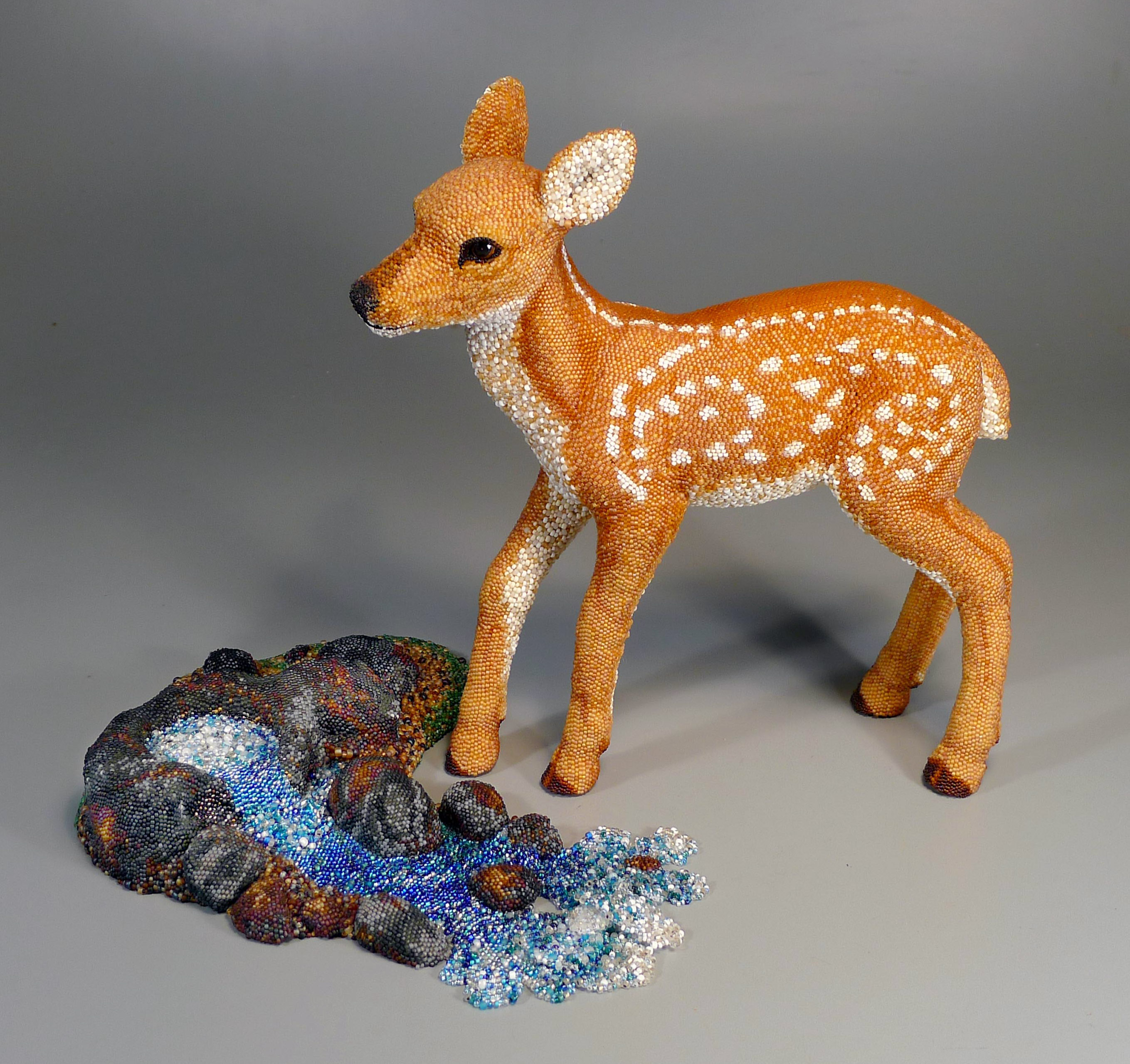 Resin(?) fawn, glass seed beads (peyote stitch), thread, wood
