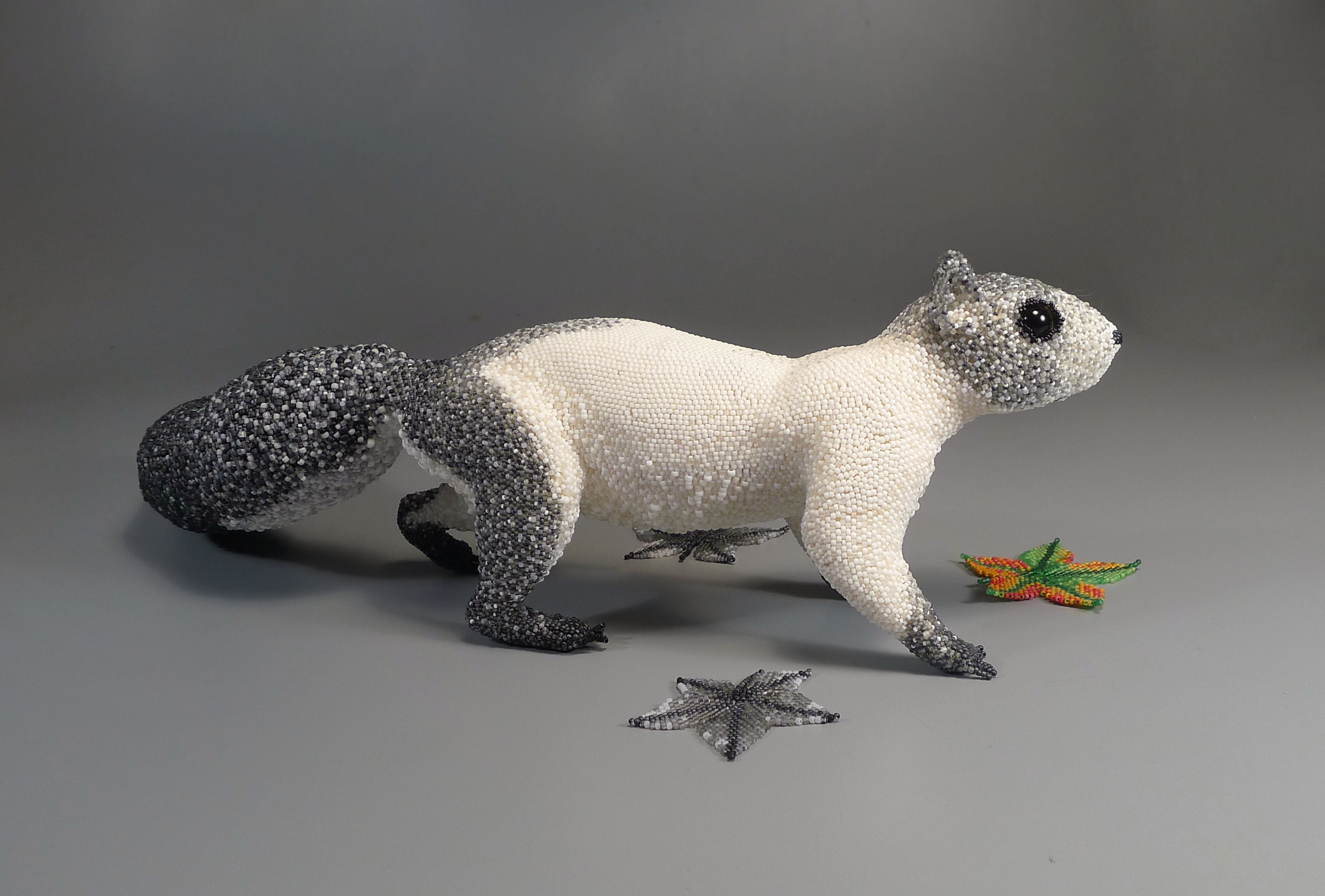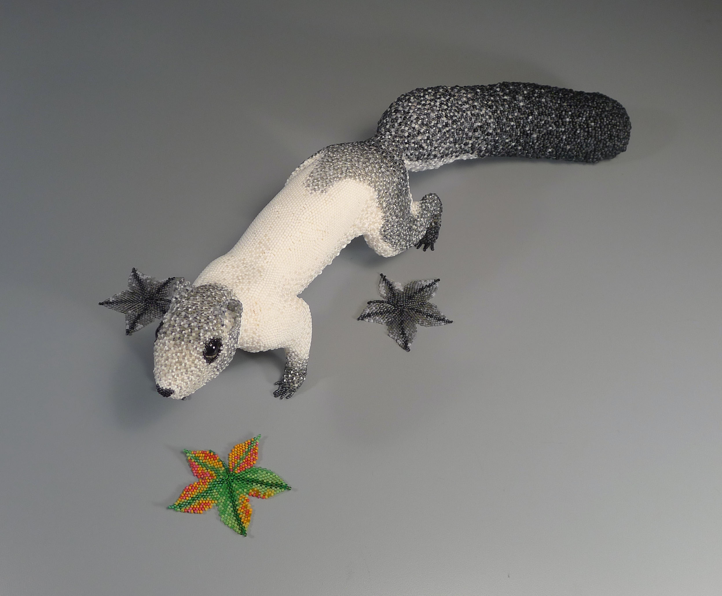 Life Desaturated, my second life-sized squirrel, was created for the World On A String: Exploring Contemporary Interpretations of Bead Work exhibition at Mobilia Gallery in Cambridge, MA (July 11 – September 2, 2017). He took roughly five months to complete and was worked in glass beads using a traditional Native American technique called peyote stitch, over a dense foam core.