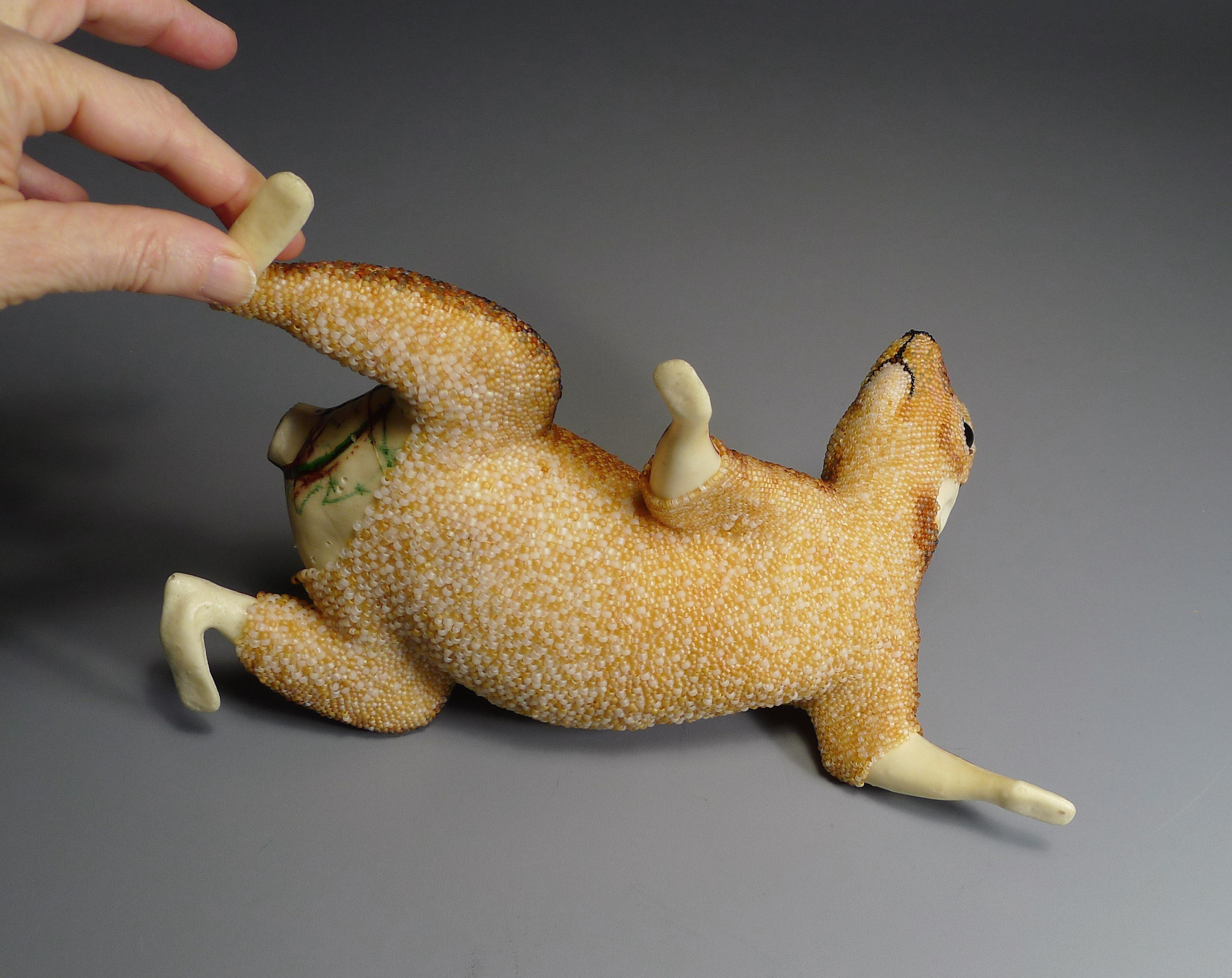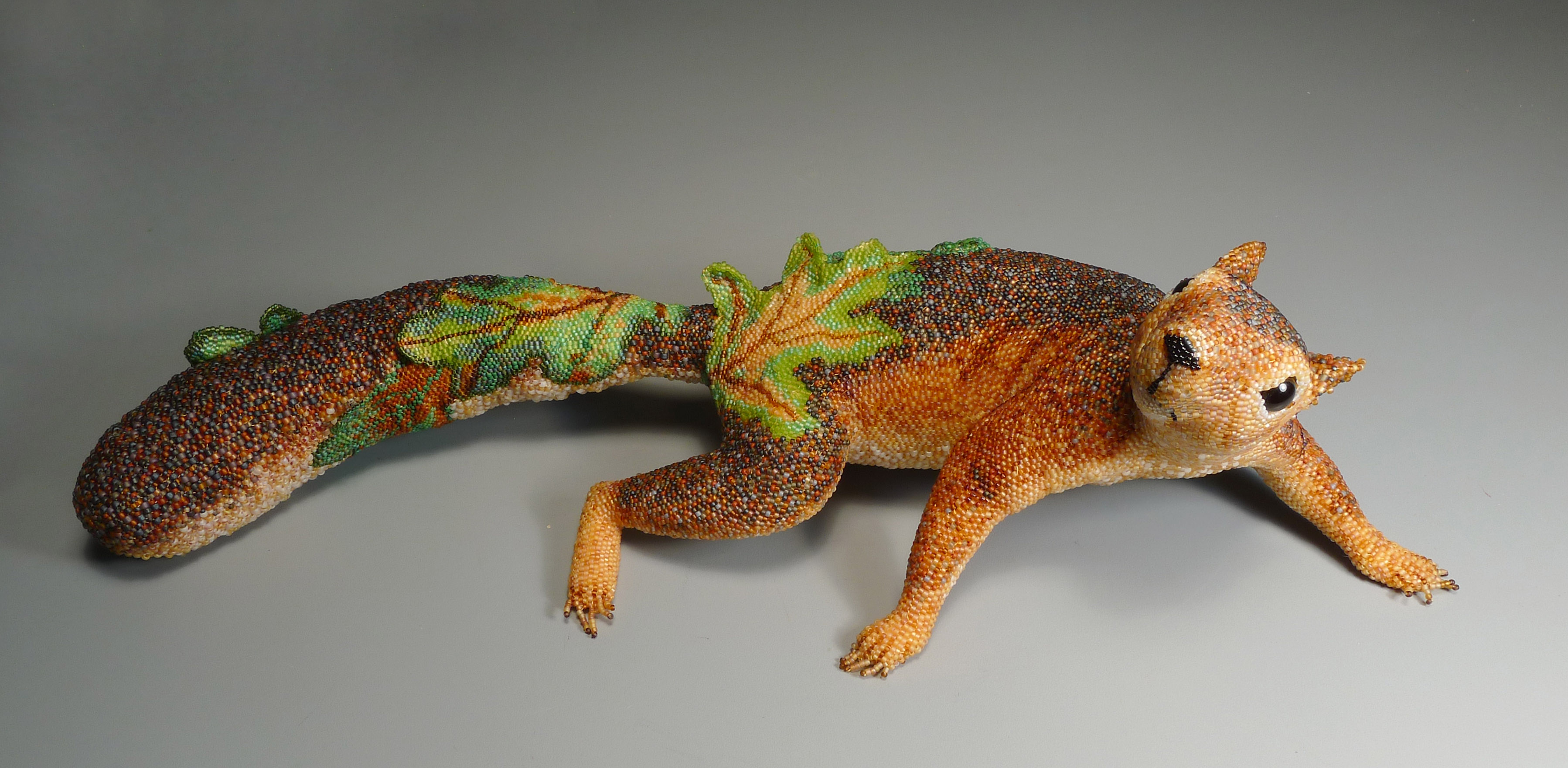 Similarly to many of my other works, the beadwork on this sculpture was created in peyote stitch over a dense-foam form. The animal is equivalent in size to a largish, life-size squirrel. Although he can rest on all four paws, he prefers to hang upright by one fore-paw, as though he is climbing the wall. (Sounds, figuratively, a bit like me sometimes!)