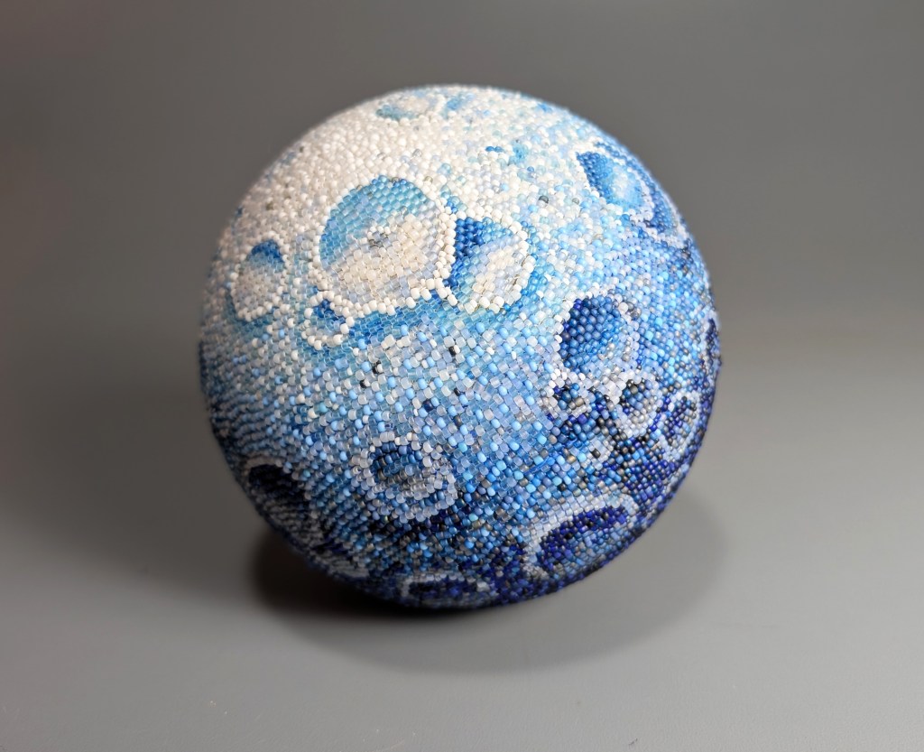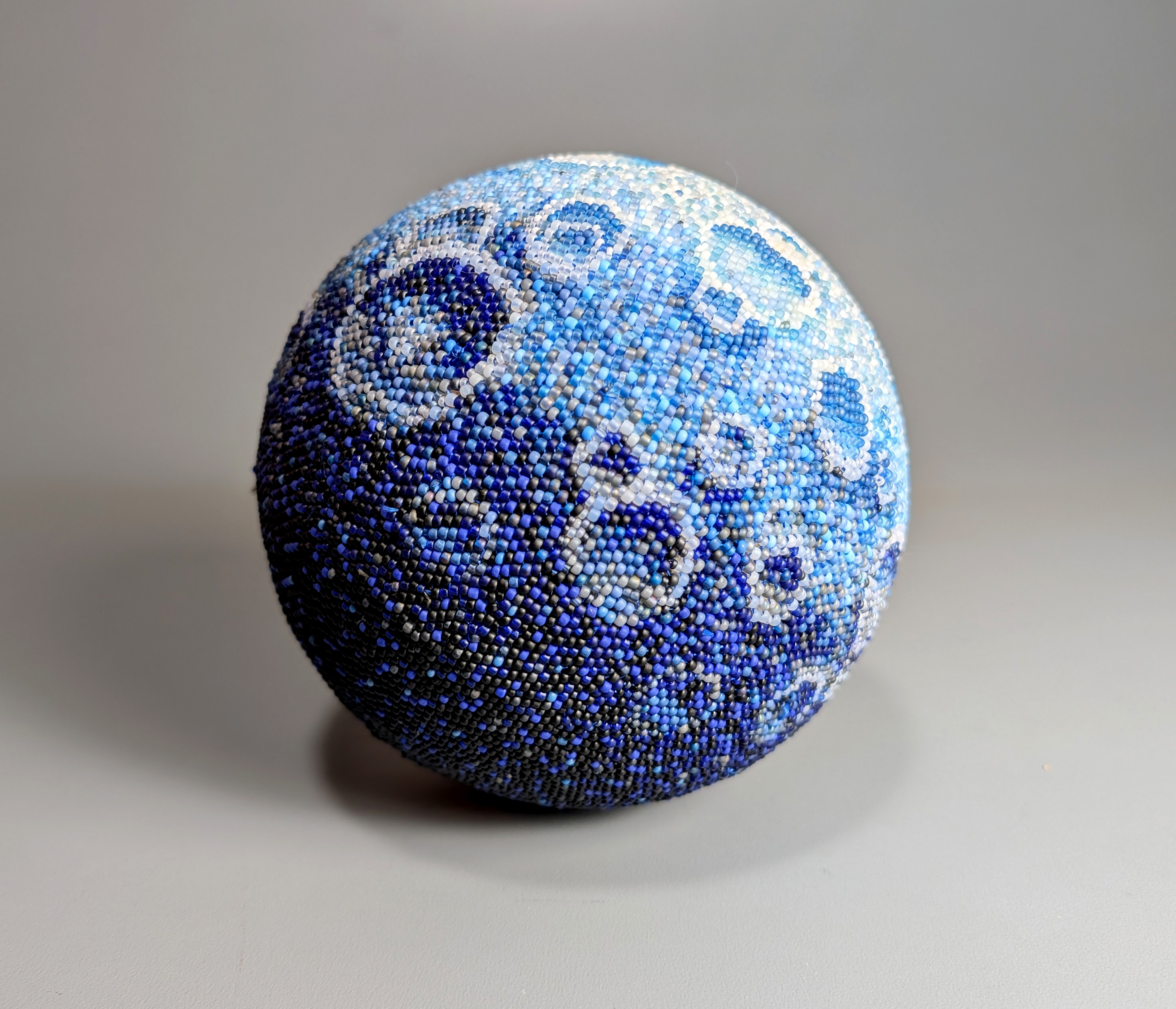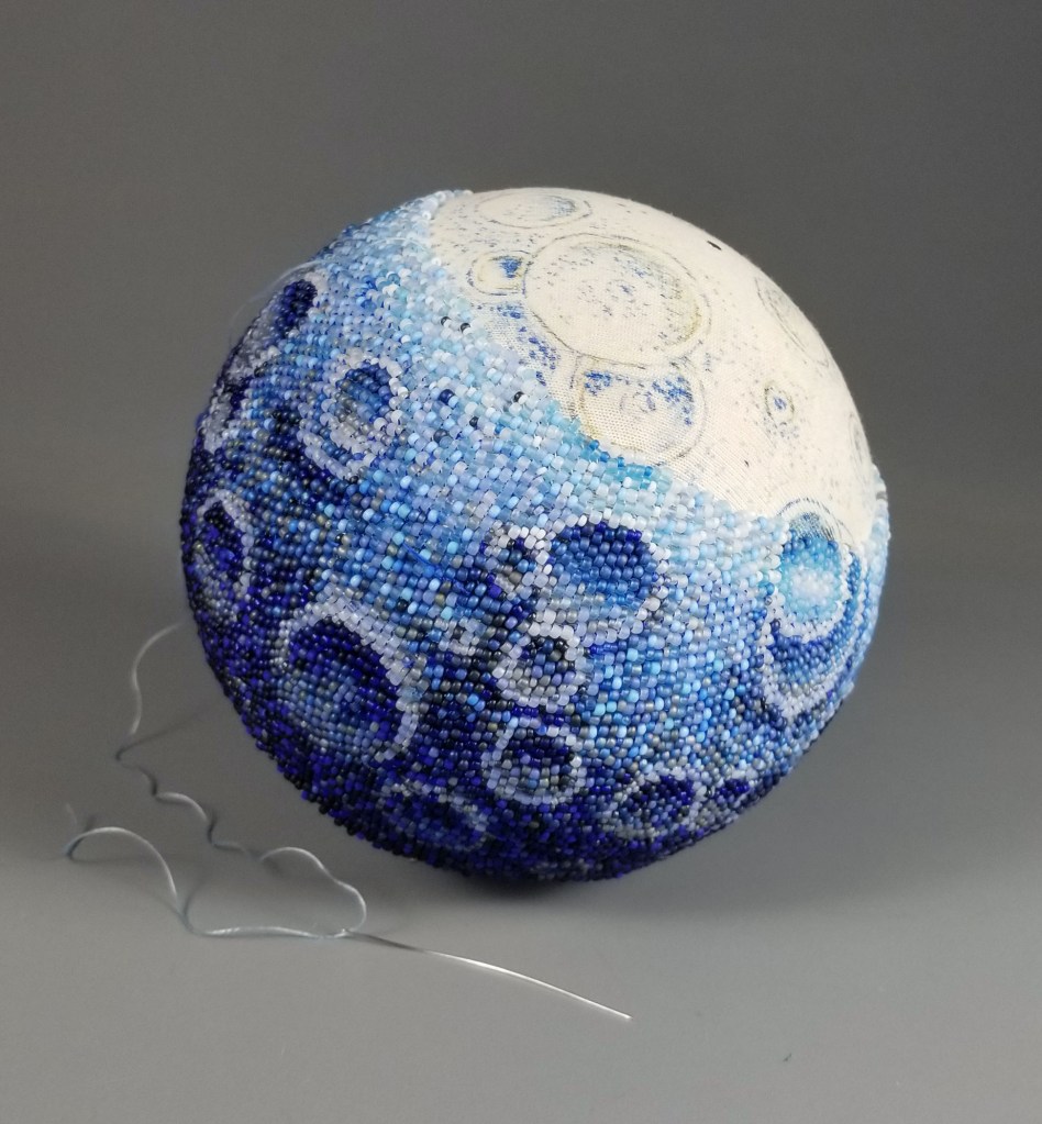 In the end, I quit resisting and acquired a 5-inch wooden sphere. I methodically cut up, stretched, and glued on the piece of fabric that eventually was used to anchor the beadwork. (A single string of beads was stitched down to encircle the moon’s “equator.” There are no other attachments.) One day, as I sketched on imagined lunar craters, Billie Holiday’s “Blue Moon, You Left Me Standing Alone” began to play, demanding that my sculpture take that name and coloring. What choice did I have?
