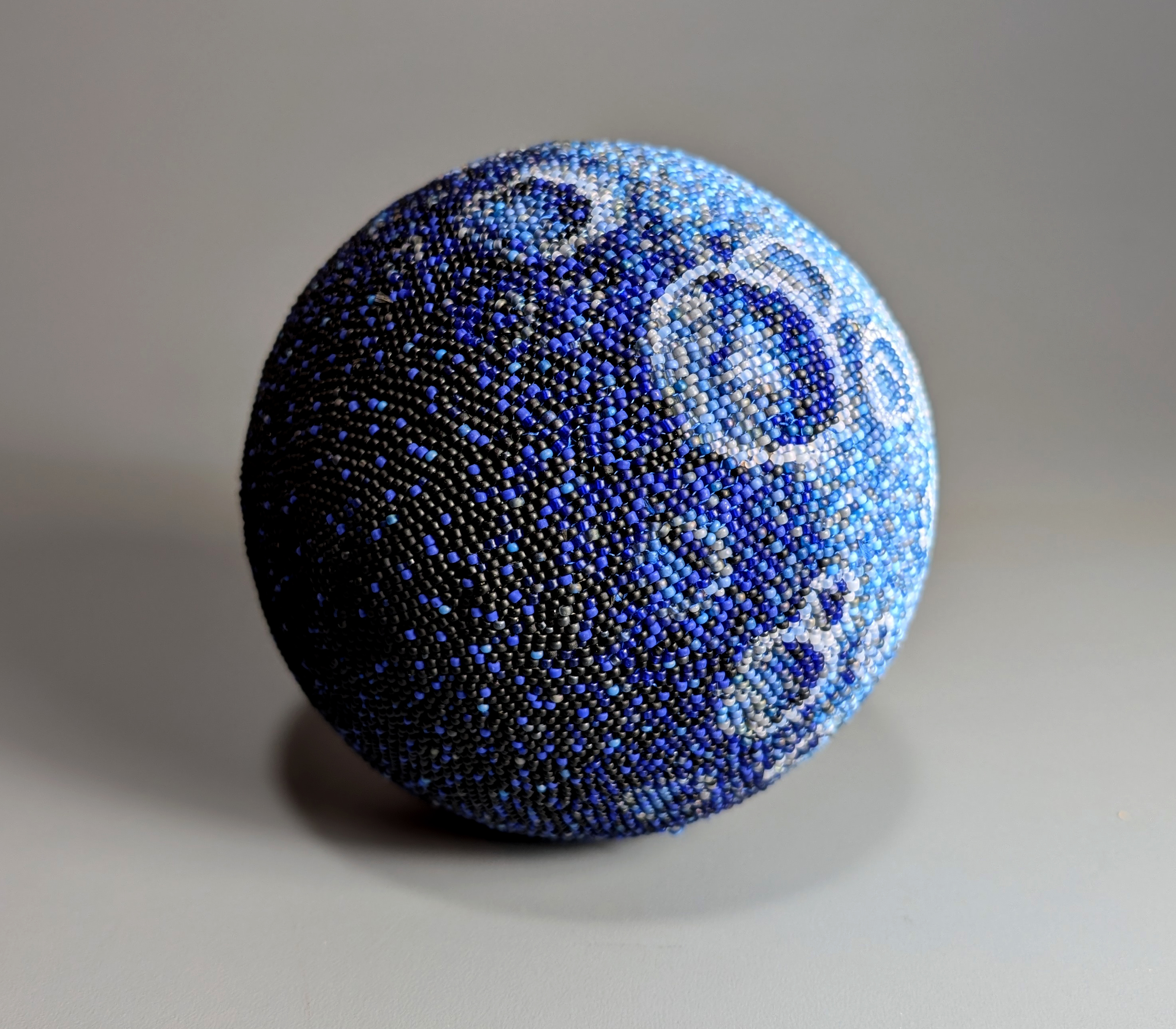 Glass seed beads and thread, worked in peyote stitch over cloth-covered wooden ball